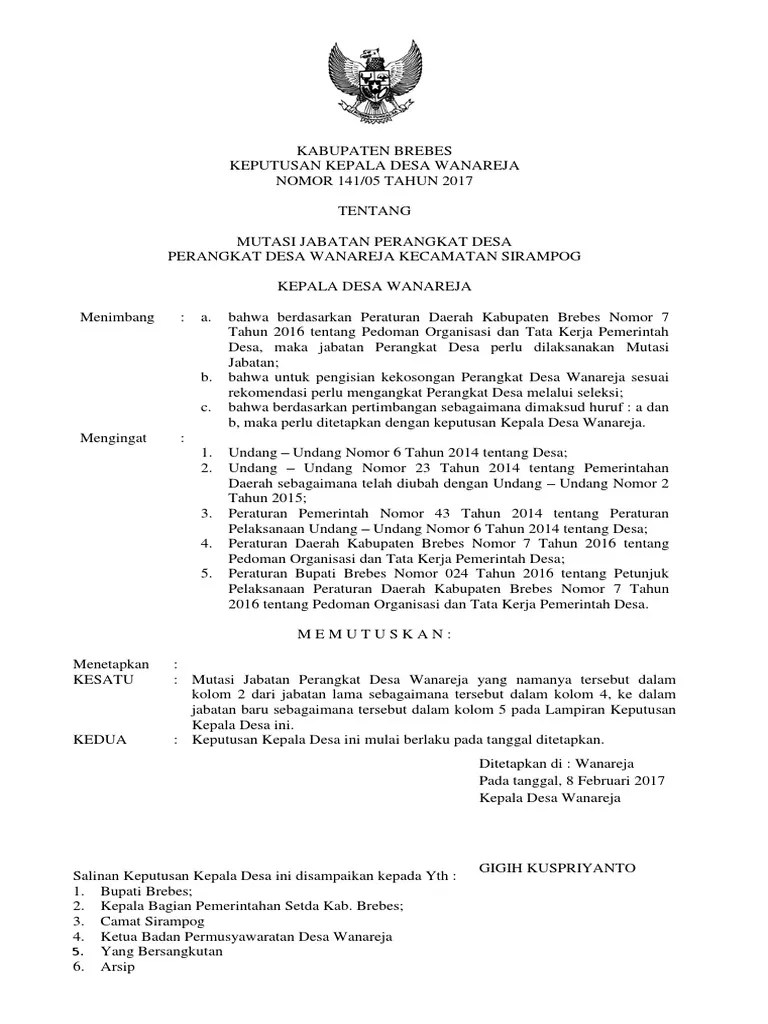Pembatalan surat keputusan kepala desa sinomwidodo tentang pengangkatan kepala urusan . Tahun …… tentang pedoman pengangkatan dan pemberhentian perangkat desa;. A, bahwa mengacu kepada peraturan daerah kabupaten bandung nomor 11 tahun 2007 tentang pedoman organisasi pemerintah desa dan perangkat desa, . Pemberhentian dan pengangkatan perangkat desa sumber rejo. Dengan rahmat tuhan yang maha esa.